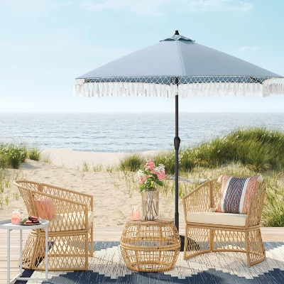 Enjoy outdoor drinks with friends or serve an after-swim snack to the kids with the help of this 7.5-Foot x 7.5-Foot Fringe Patio Market Umbrella from Threshold™. Made with fade-resistant fabric for lasting outdoor use, the umbrella has a black pole and steel frame and is compatible with centered pole umbrella bases (sold separately). It’s easy to set up with no tools needed, and with a push-up lift and push-button tilt, you can effortlessly adjust the umbrella to maintain the perfect shady spot.