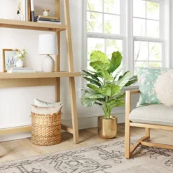 Pair your favorite plants in style with this Medium Brass Planter from Threshold™. This medium brass planter makes a stylish piece for tabletop or floor placement. It features a modern cylindrical shape in a lacquered gold metal finish for chic and shiny flair. This stylish planter has a leakproof design to keep your space mess-free and is perfect for housing a variety of leafy greens, botanicals and faux plants. You can place it anywhere indoors for a welcoming look.