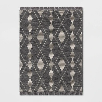 Make your outdoor space a little more welcoming with this Striped Diamonds Rectangular Woven Outdoor Area Rug from Threshold™. This rectangular woven rug showcases a striped diamonds pattern in a subtle tone with fringe detailing for a stylish look that blends effortlessly with any decor scheme. Made from polypropylene-blend material with a latex backing to help it stay in place, this flat-pile area rug is suitable for high-traffic areas like your entryway or patio — perfect for creating visual depth in your exteriors.